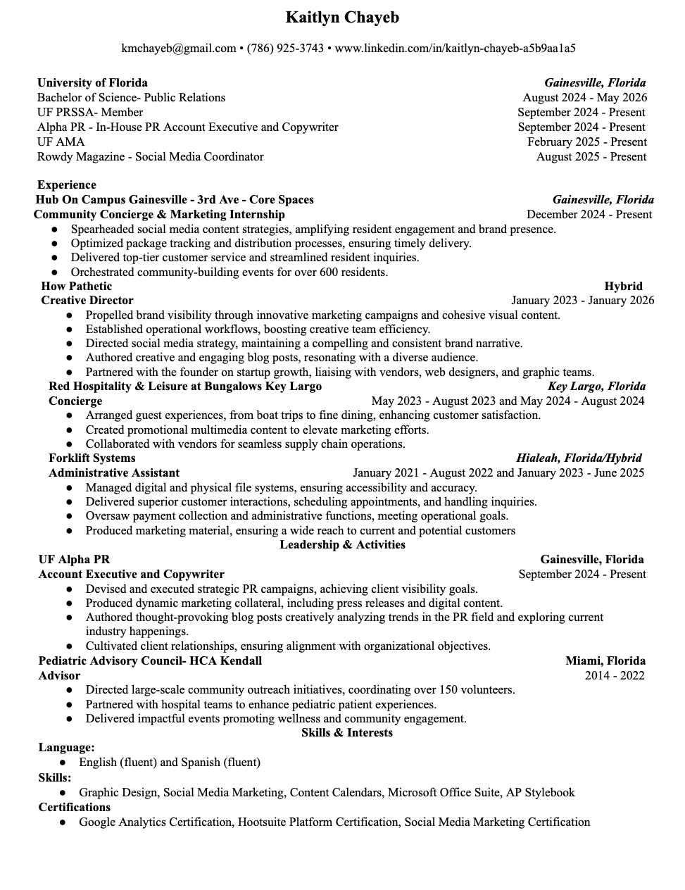 I have experience across hospitality, startup marketing, and gen z forward media environments, where I have contributed to marketing campaigns, managed social media content, and produced written communications.